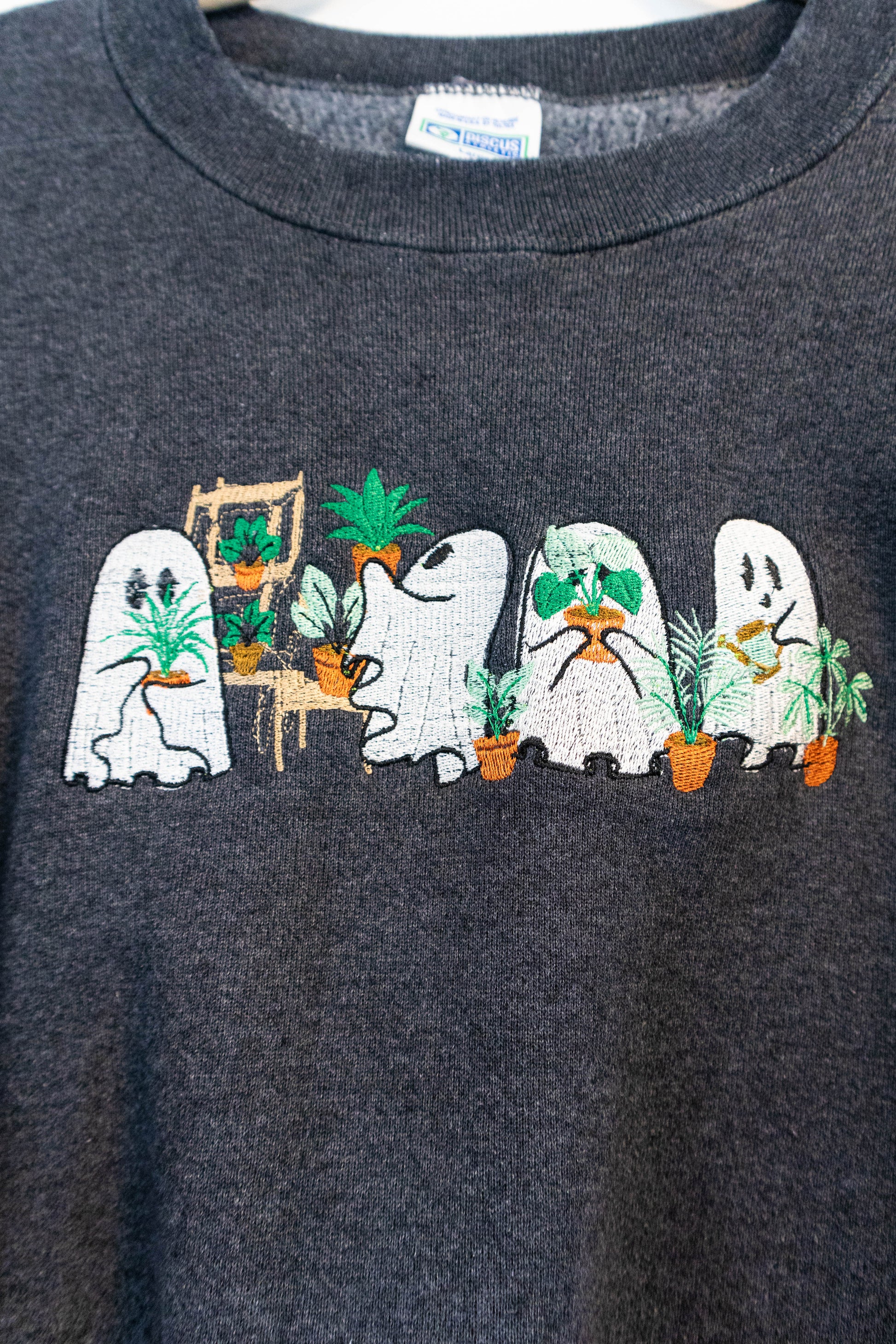 For the ghost who’s really just a plant parent. This cozy charcoal sweatshirt features a row of embroidered ghosts proudly showing off their houseplants — a little spooky, a little sweet, and totally one-of-a-kind.