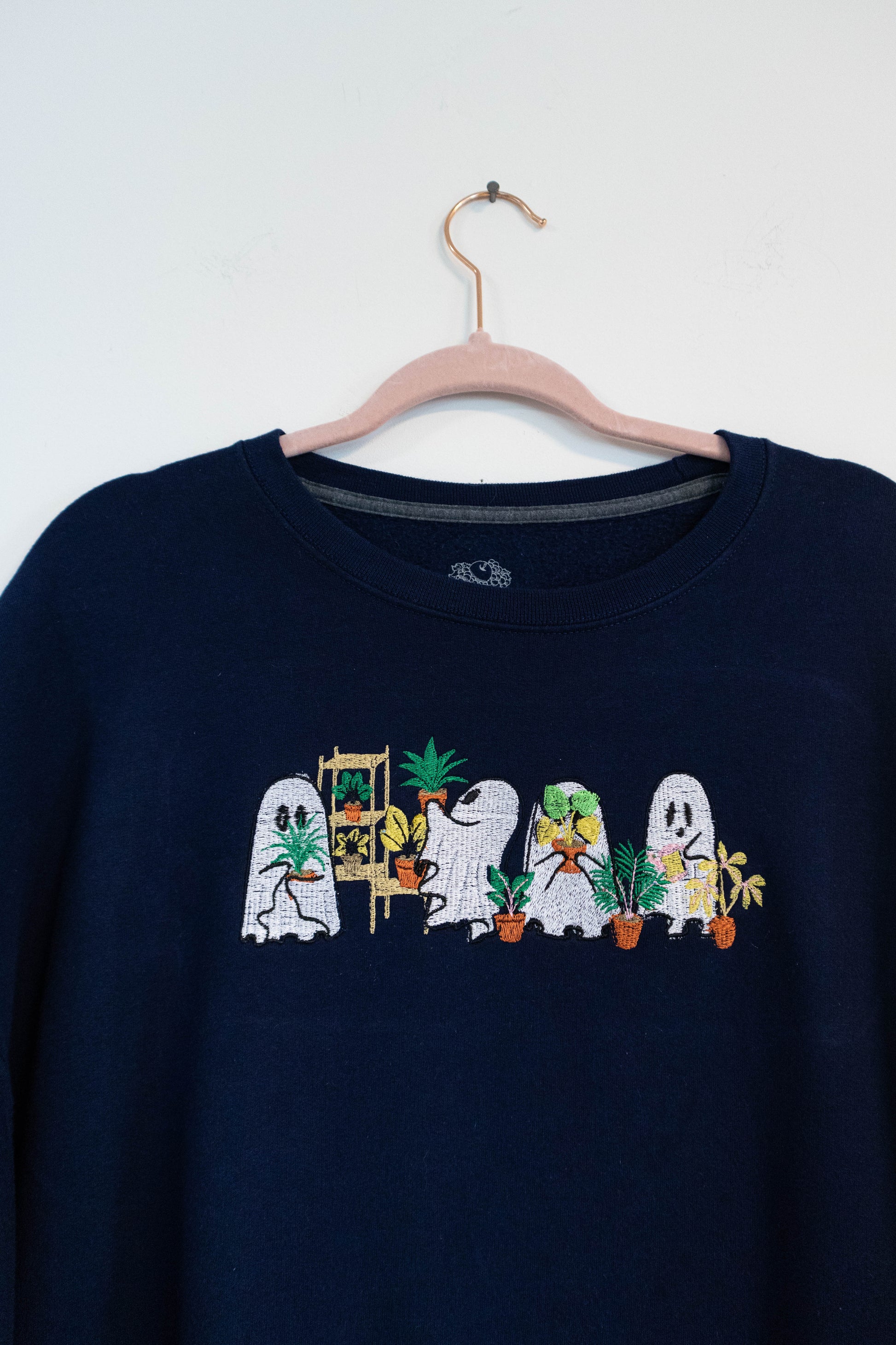 For the ghost who’s really just a plant parent. This cozy charcoal sweatshirt features a row of embroidered ghosts proudly showing off their houseplants — a little spooky, a little sweet, and totally one-of-a-kind.