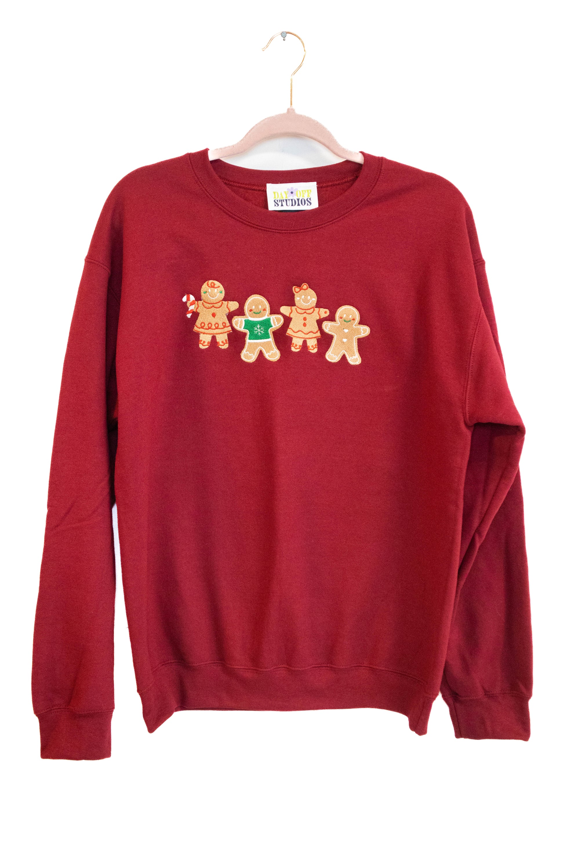 Bring the sweetest touch of holiday cheer to your winter wardrobe with this cozy embroidered sweatshirt. Featuring four adorable gingerbread characters—each with their own festive personality—this piece is the perfect blend of whimsy and handmade charm.