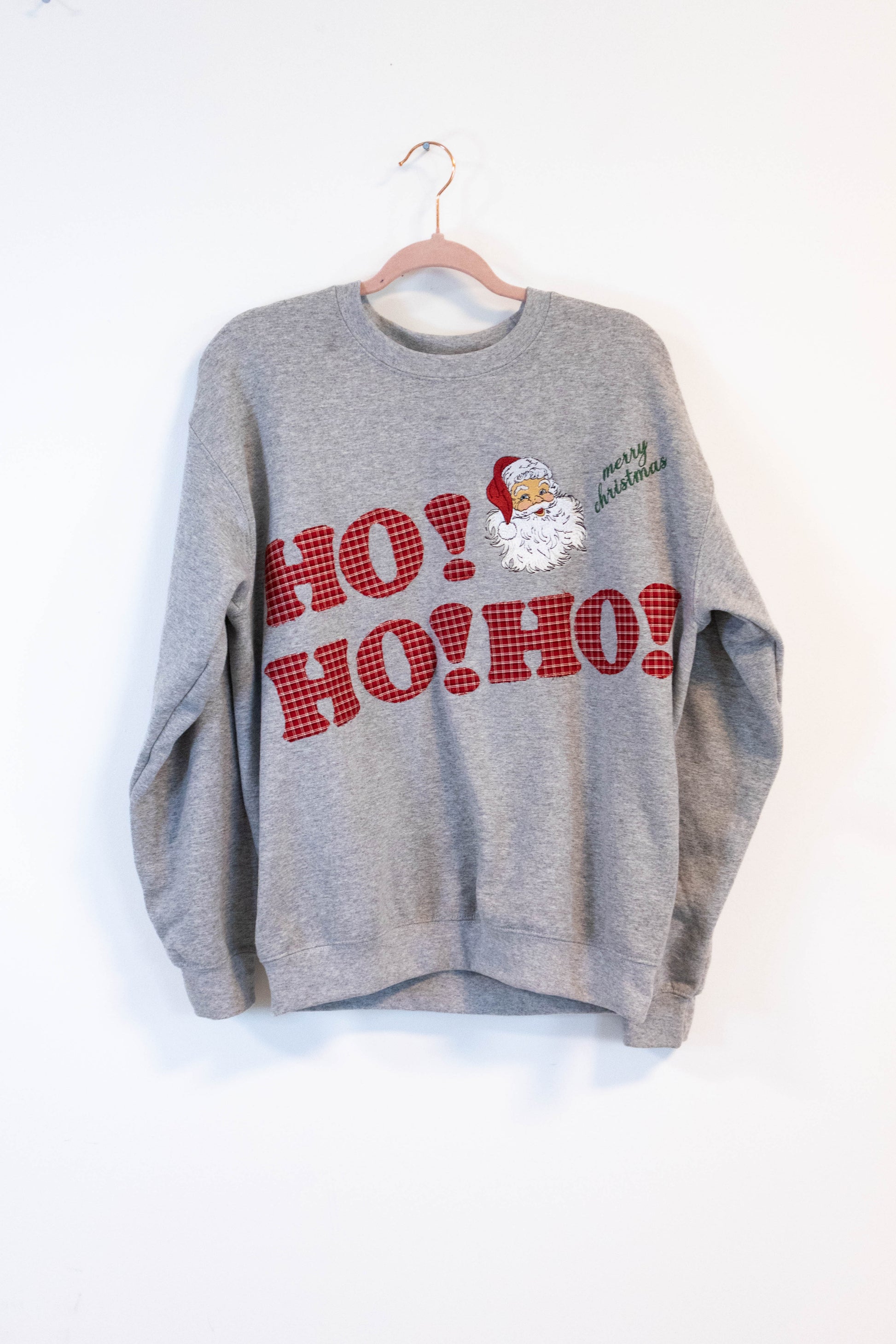 - Grey crewneck sweatshirt with large HO! HO! HO! plaid lettering