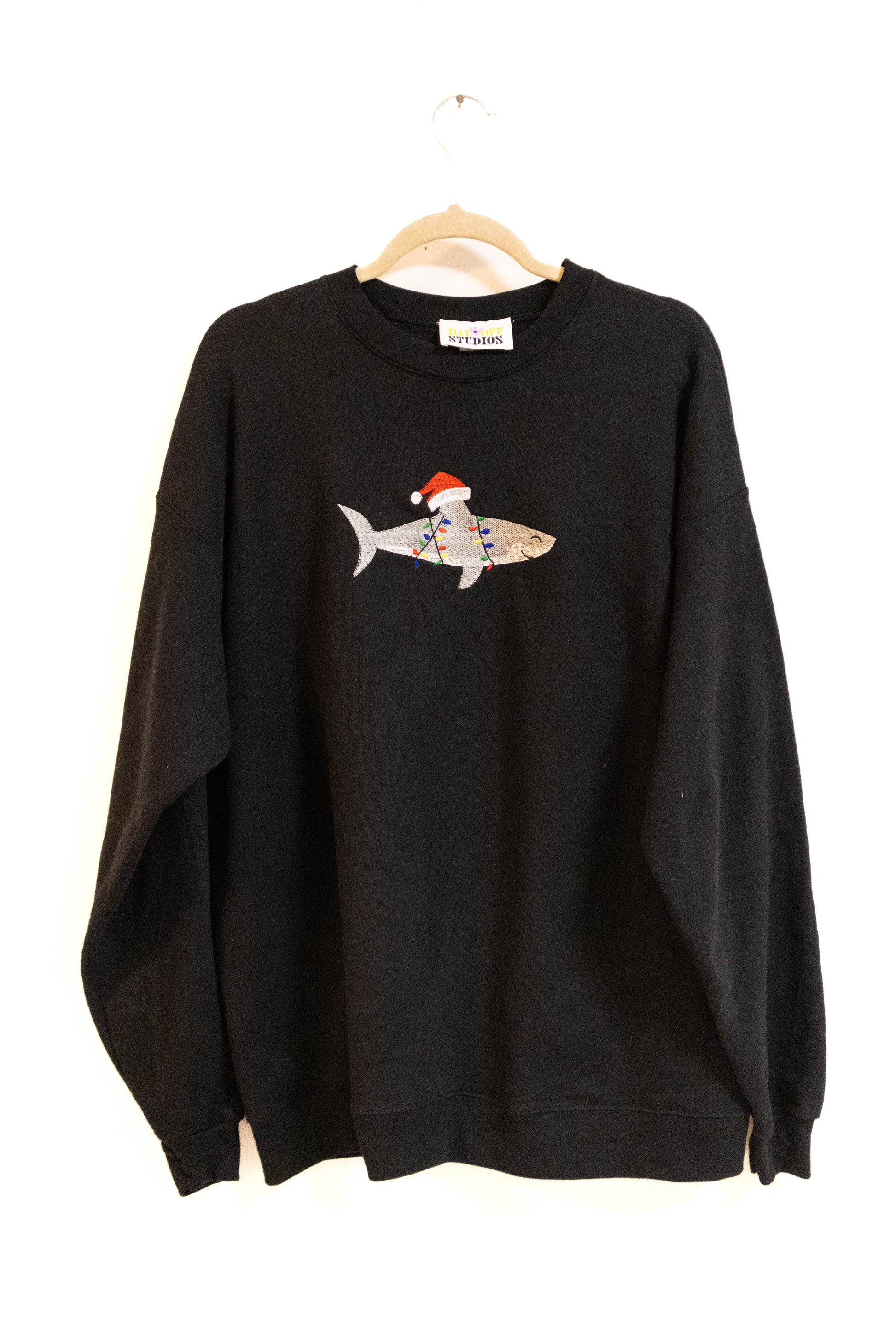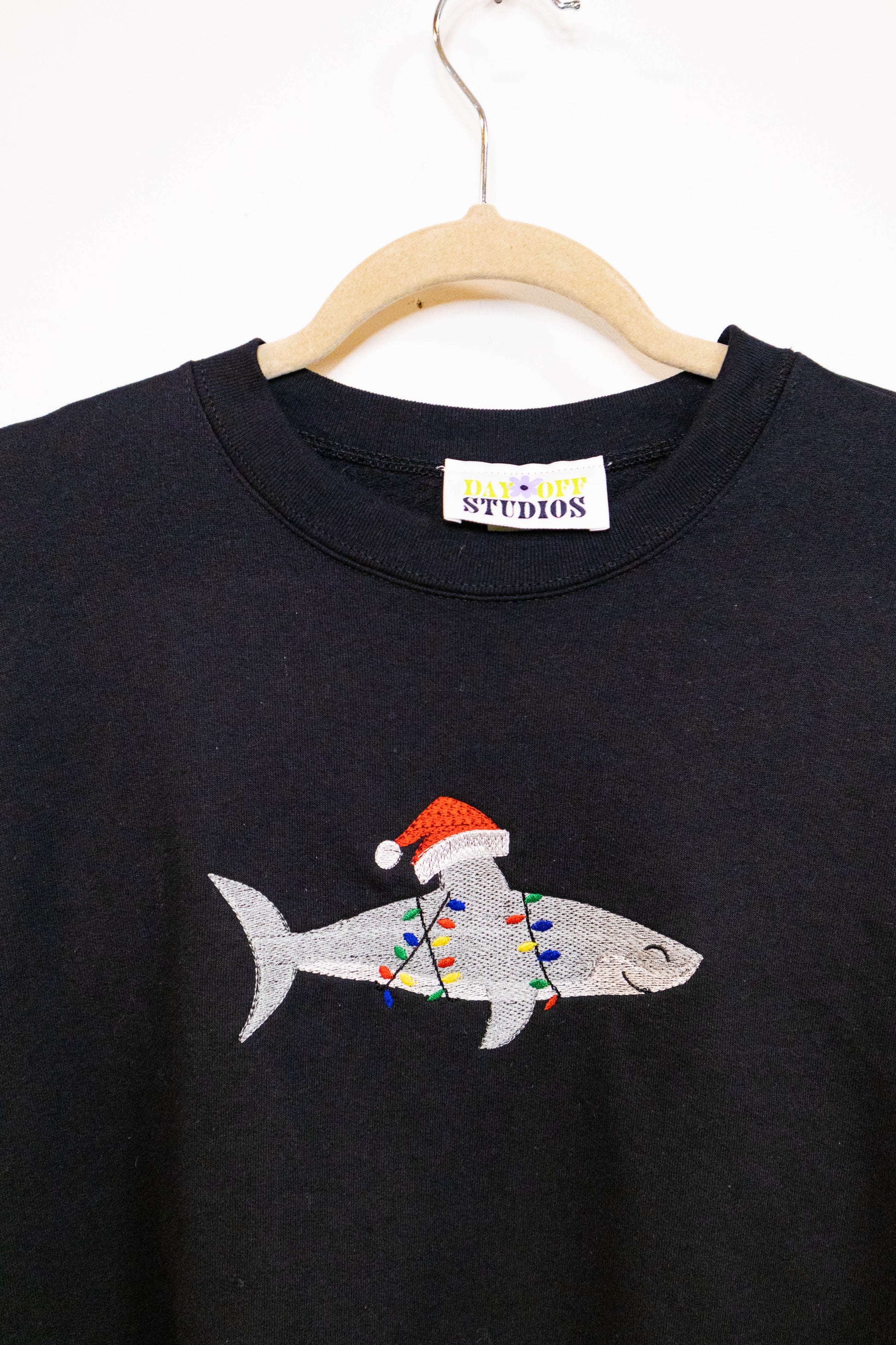 Designed and embroidered in-house at Day Off Studios, this upcycled black crewneck brings some playful cheer to the holiday season. Featuring a shark wearing a Santa hat and wrapped in colorful Christmas lights, this sweatshirt blends whimsy with craftsmanship.