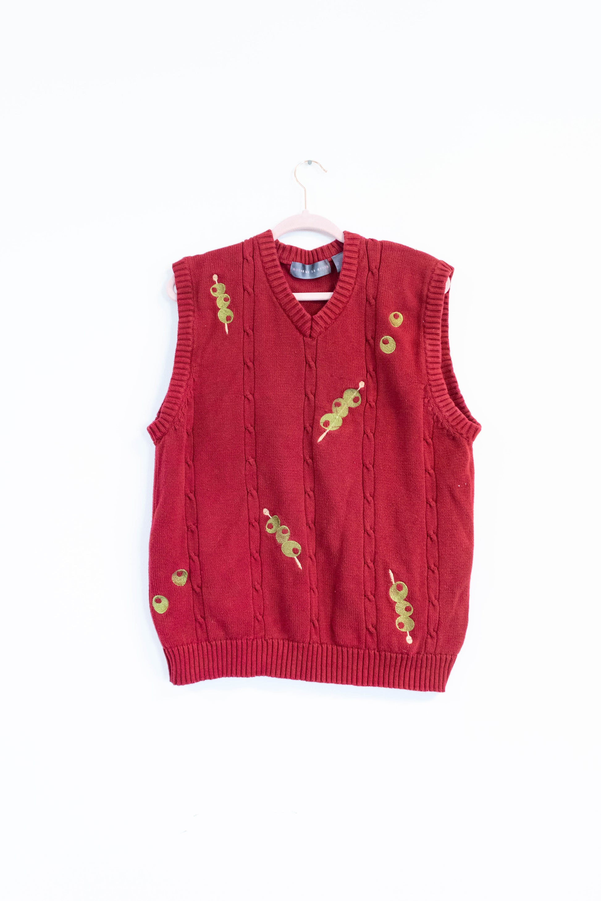Discover the unique charm of this upcycled Oscar De La Renta sweater vest, featuring delicate olive embroidery. Perfectly crafted for olive and martini enthusiasts, this piece blends luxury with sustainable style. Elevate your wardrobe with a statement that’s both eco-conscious and effortlessly chic.