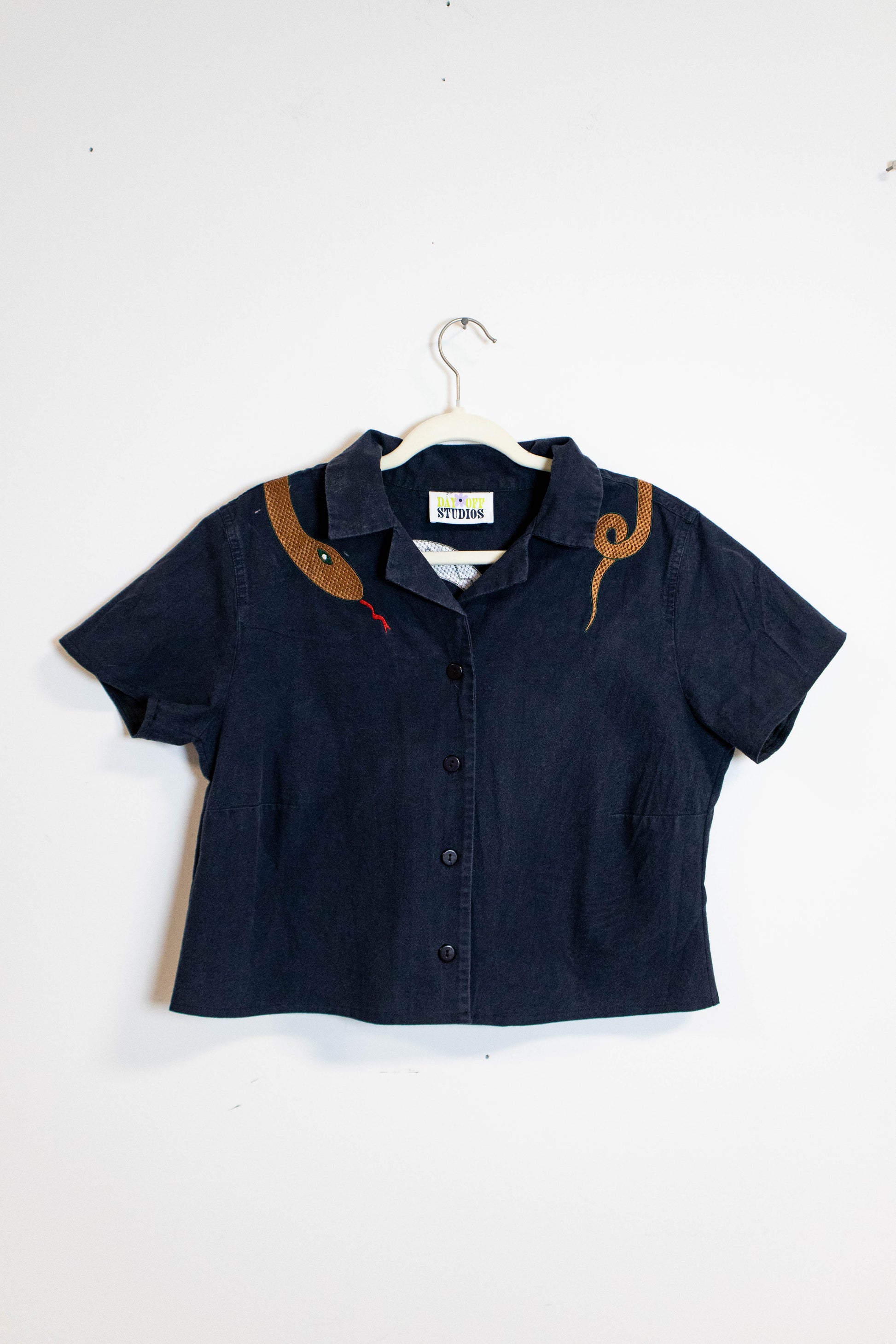 Upcycled black short sleeve button down featuring custom snake embroidery across the front shoulders and full back. Cropped length with a structured, easy fit.