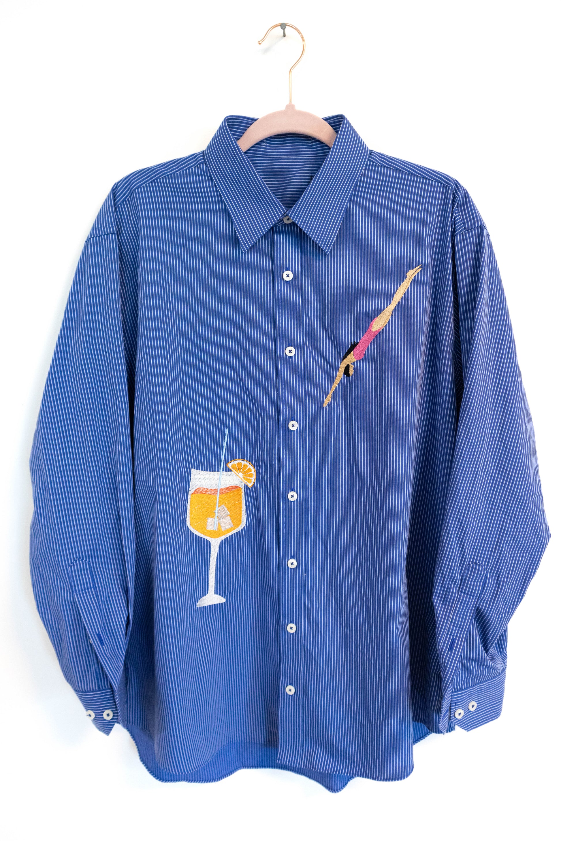 A classic blue striped button-up transformed into a one-of-a-kind statement piece. This upcycled shirt features two custom hand-embroidered designs: a retro-style diver and a detailed cocktail glass with ice and an orange slice. Each embroidery is stitched in-house, giving the shirt a bold and playful touch.
