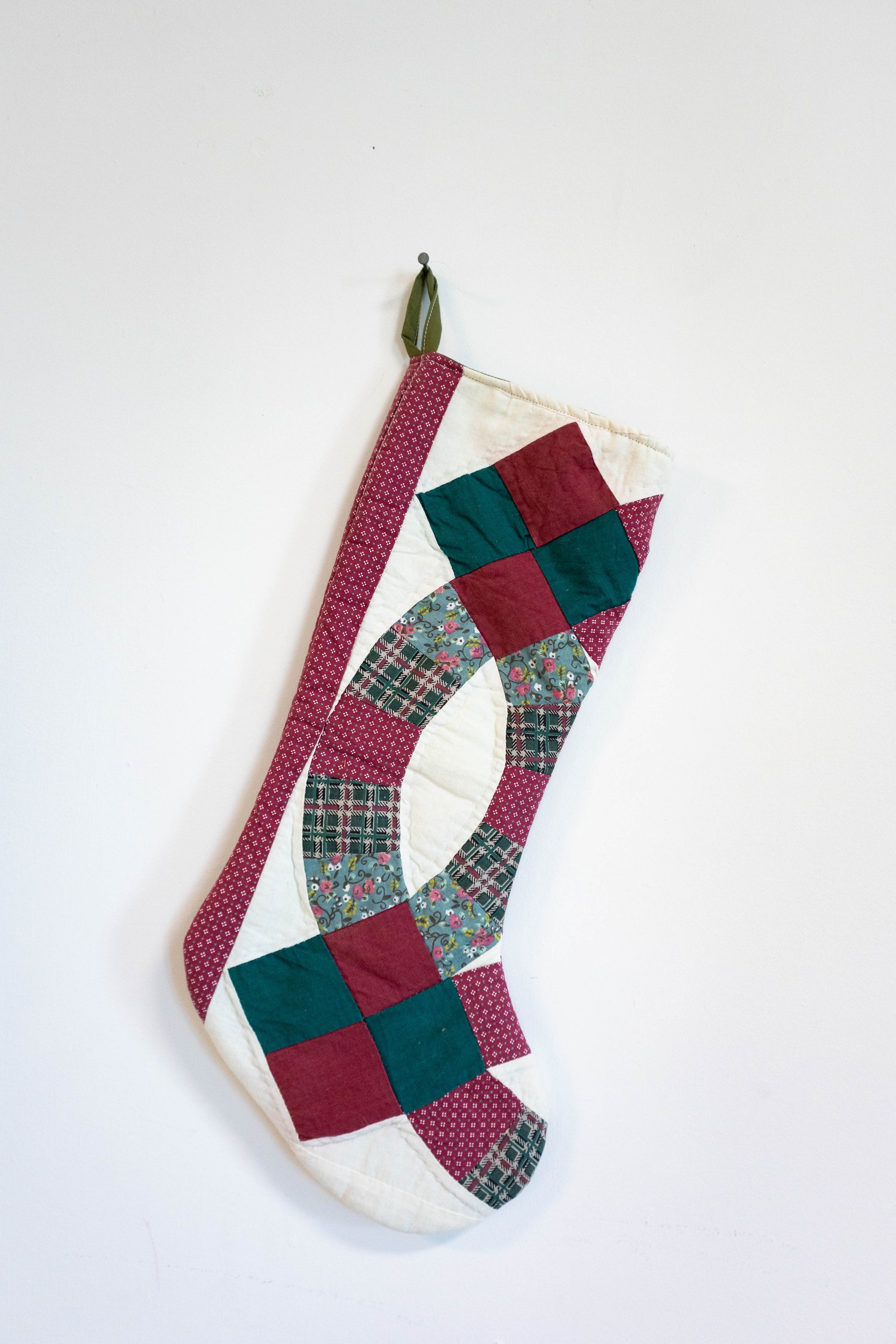Bring a touch of nostalgic charm to your holiday décor with this collection of handmade Christmas stockings, created from a well-loved, repurposed vintage quilt. Each stocking carries its own story, stitched together from decades-old fabrics, worn soft with time, and lovingly repaired in places to preserve its character.