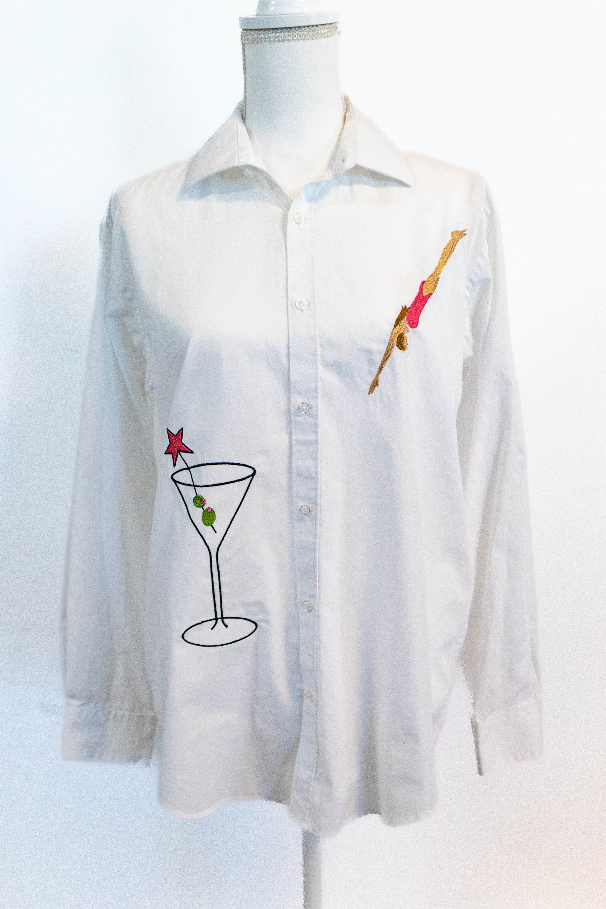 Upcycled white button down with custom embroidery — a diver on one side and a martini glass on the other. Each piece is one-of-a-kind and embroidered by Day Off Studios.