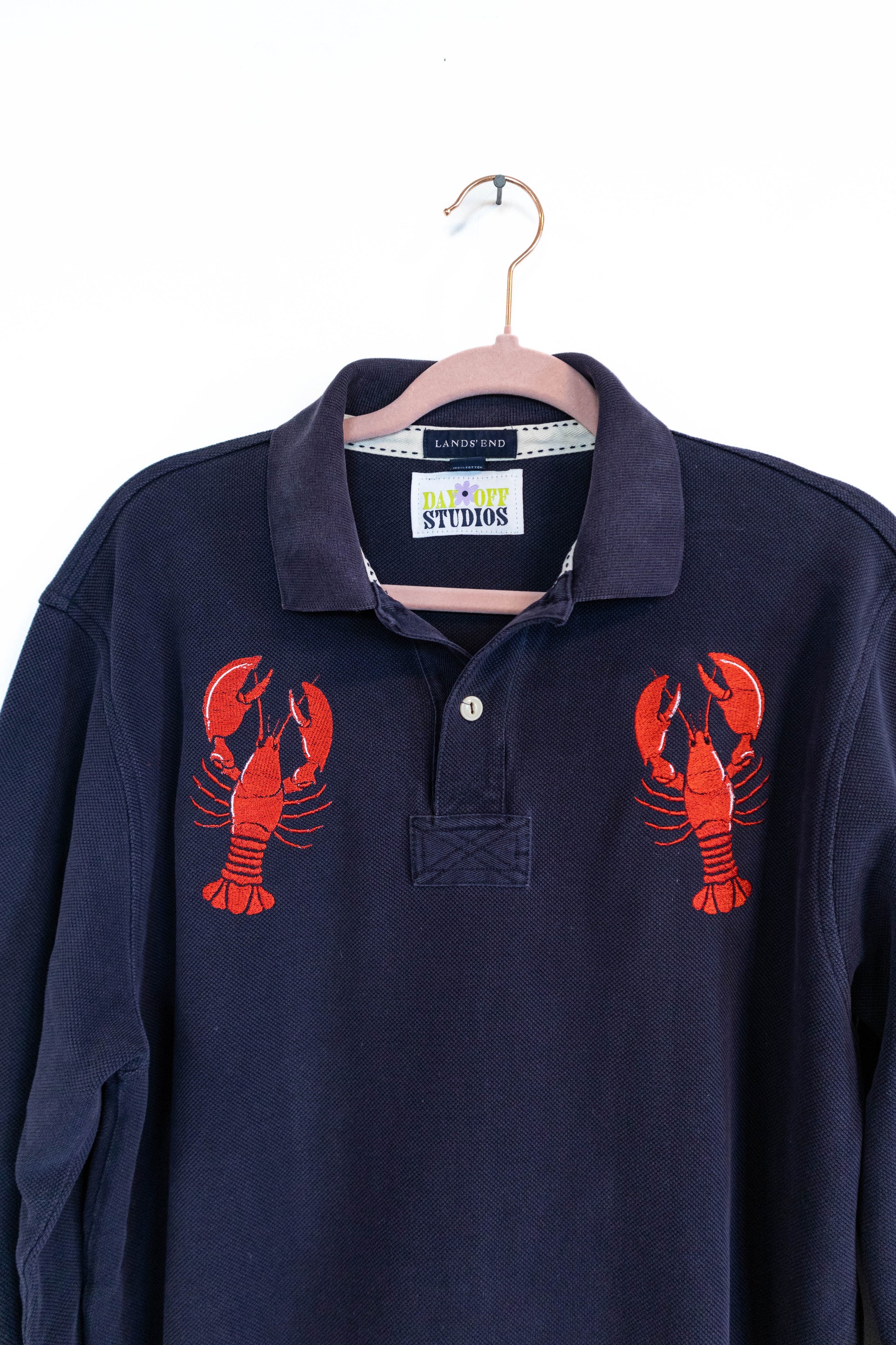 This upcycled long-sleeve polo has been transformed into a standout piece with two bold, hand-embroidered lobsters on the chest. The classic navy shirt gets a fresh, playful upgrade with bright red stitching, giving it a unique look while keeping the original comfort and structure of the garment.