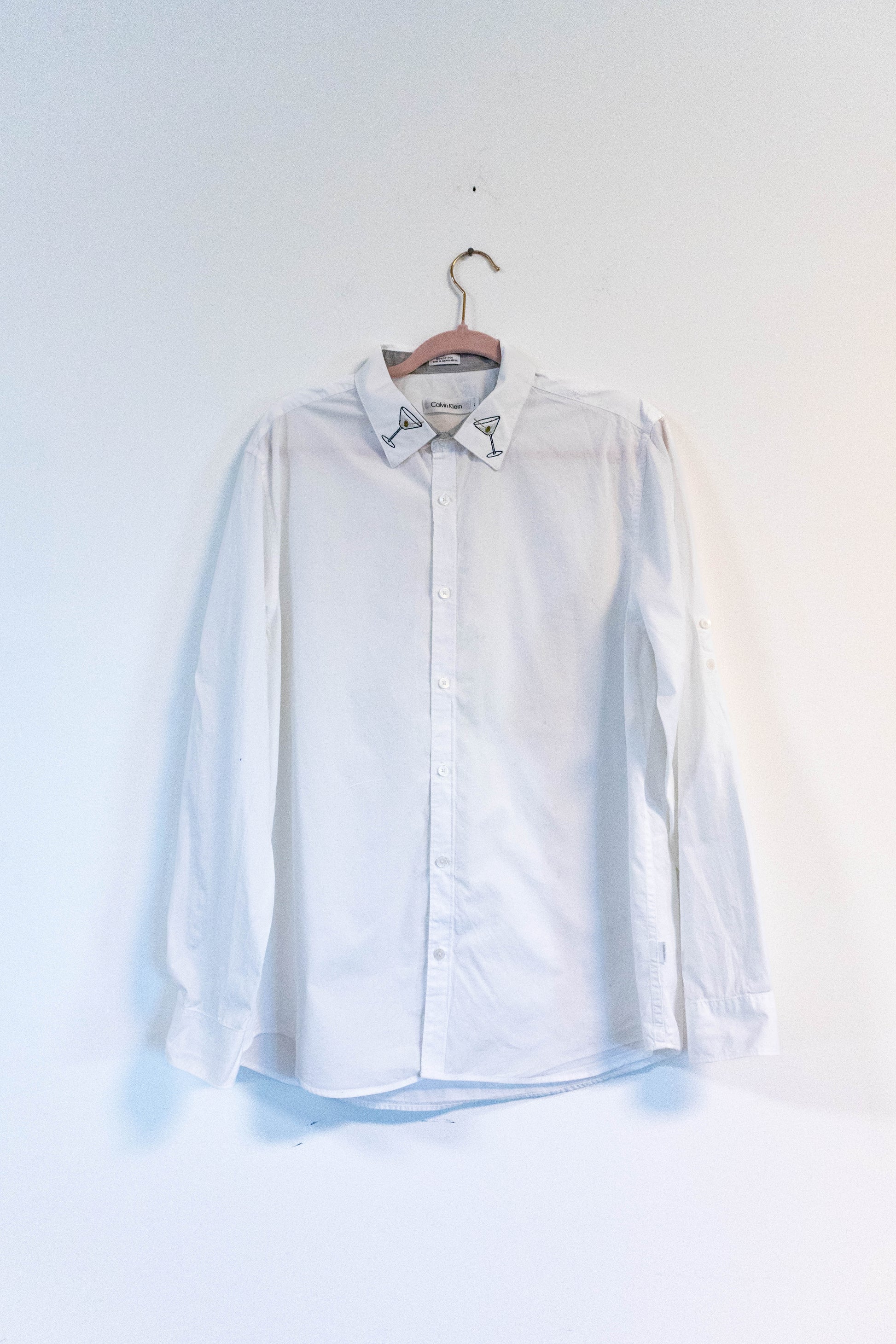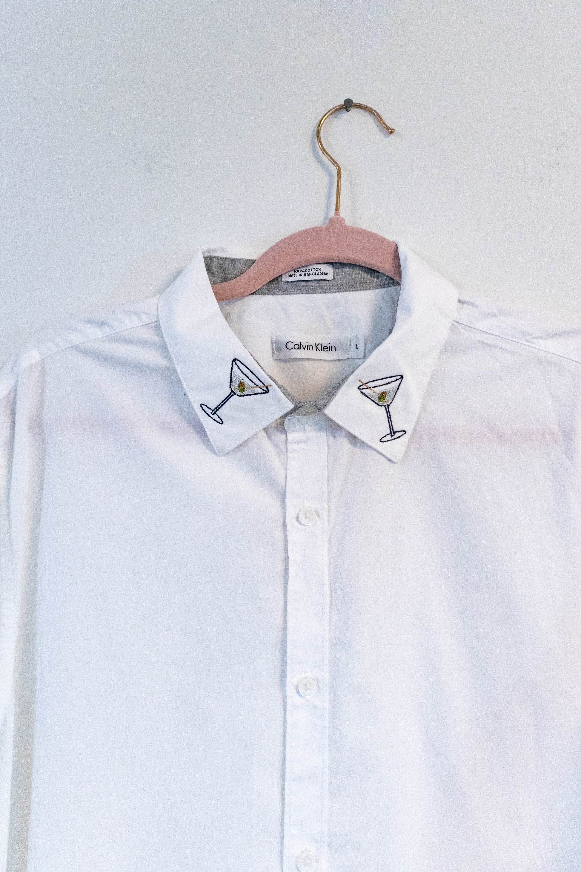 Upcycled White Calvin Klein Button-Down – Martini Collar Embroidery